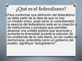 El documento define el federalismo como una forma de gobierno que permite reconciliar la unidad política con la diversidad mediante la creación de instituciones que acomoden los intereses y valores diversos de una sociedad. Explica que los Estados Unidos surgieron como un estado federal tras la Guerra de Independencia para hacer compatibles los intereses de las 13 colonias originales. La Convención de Filadelfia de 1787 creó una Constitución que estableció un gobierno federal fuerte para unir a los estados de manera permanente.