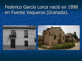 Federico García Lorca nació en 1898 en Granada. Su madre le enseñó a amar la música y la poesía desde pequeño. Estudió derecho en Granada donde conoció al compositor Manuel de Falla. Publicó su primera obra en 1918 con ayuda de su padre. Se mudó a Madrid donde se hizo amigo de Luis Buñuel, Rafael Alberti y Salvador Dalí. Más tarde viajó a Nueva York y escribió "Poeta en Nueva York". A su regreso a España fundó la compañía de teatro La Barraca.