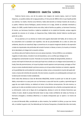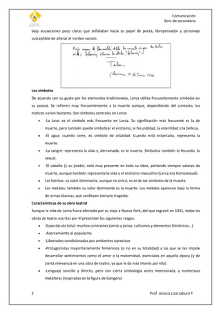 Este documento presenta información sobre el poeta español Federico García Lorca. Nació en un pueblo andaluz en 1898 y se estableció con su familia en Granada a los 11 años. Sus obras, incluyendo poemas y dramas, capturan la música y costumbres de la sociedad rural española y exploran temas como el amor, la muerte y la identidad. Sus últimas obras teatrales, como La casa de Bernarda Alba, retratan la opresión de las mujeres y la pasión reprimida. Lorca fue deten