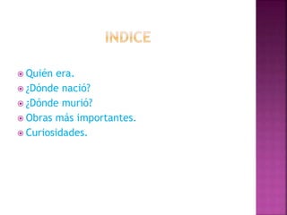 Federico García Lorca fue un poeta y dramaturgo español nacido en 1898 en Granada, España. Entre sus obras más importantes se encuentran Libro de poemas, Poema del cante jondo, Romancero gitano y Poeta en Nueva York. Fue fusilado en 1936 durante la guerra civil española por ser homosexual y republicano.