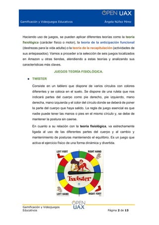 Este documento describe seis juegos y videojuegos y cómo se relacionan con tres teorías del desarrollo infantil. Se analizan Twister y Just Dance en relación a la teoría fisiológica por promover la actividad física. Operation y ser veterinario en Australia se vinculan a la teoría de la anticipación funcional por preparar destrezas para la vida adulta. Catan y cazar en Hunting Simulator 2 se asocian a la teoría de la recapitulación por simular actividades históricas.