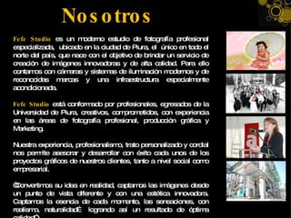 Fefe Studio es un moderno estudio de fotografía profesional en Piura, especializado en la creación de imágenes innovadoras y de alta calidad, con un equipo de profesionales en diversas áreas. Ofrecen servicios que abarcan desde fotografía social y corporativa hasta producción gráfica, siempre orientados a brindar atención personalizada y cumplir con las expectativas del cliente. Su misión es ser el líder en el norte del país, destacando por su compromiso, innovación y calidad en el servicio.