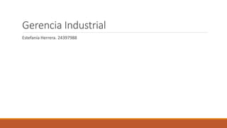 El documento habla sobre la gerencia industrial y su ámbito de aplicación. Explica que la gerencia industrial se aplica según el tipo de industria, ya sea pesada, ligera o de equipos, y que se encarga del estudio de movimientos y tiempos, higiene y seguridad, control de calidad e inventario. Además, destaca la importancia de la gerencia industrial al mejorar los procesos productivos, ayudar a alcanzar los objetivos de manera eficaz y fomentar el control interno de la organización.