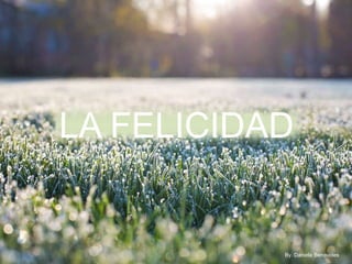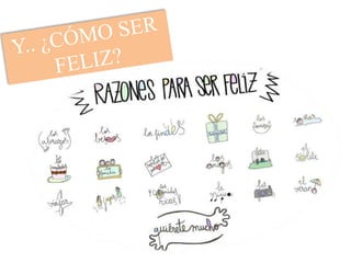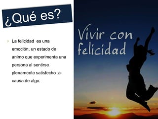 El documento habla sobre la felicidad y cómo lograrla. Define la felicidad como un estado de plenitud y equilibrio que se alcanza al estar satisfecho con uno mismo, lo que se tiene y lo que se aspira. Además, señala que la felicidad es un trayecto y no un destino, y que para ser feliz uno debe enfocarse en disfrutar la vida haciendo lo que ama.