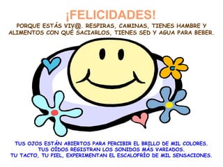 Este documento felicita al lector por estar vivo y poder experimentar las pequeñas alegrías de la vida como comer, beber y relacionarse con otros. También lo felicita por poder amar y construir su vida día a día a pesar de los sufrimientos. Finalmente, anima al lector a vivir el presente sin preocuparse del futuro y a compartir este mensaje de felicidad con sus amigos.