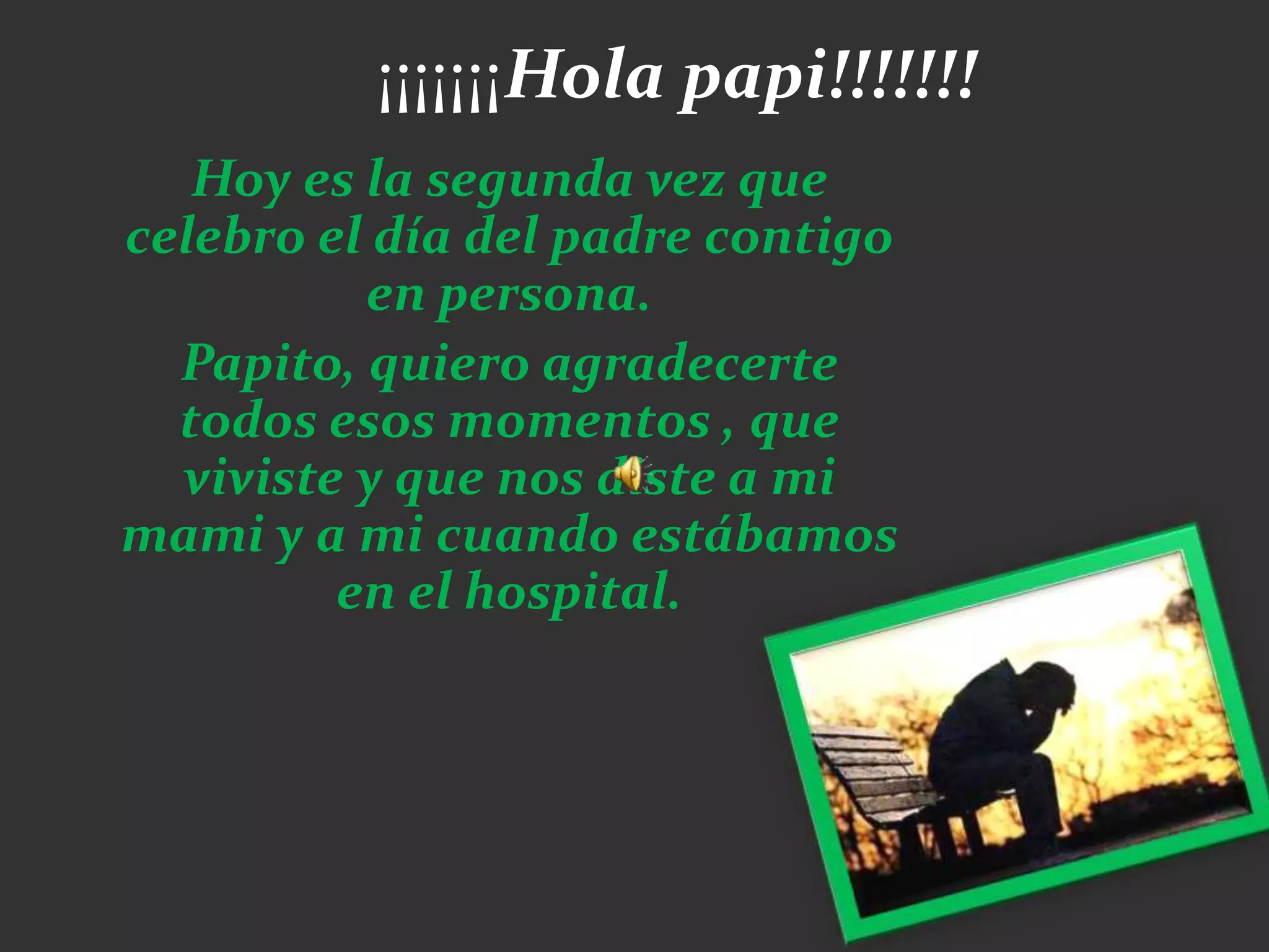 Este documento es una carta de agradecimiento de un hijo a su padre por su apoyo y fe durante momentos difíciles cuando el hijo y la madre estuvieron en el hospital después del nacimiento. El hijo expresa gratitud por cómo el padre estuvo ahí para él y la madre, animándolos a luchar y orando por su recuperación a pesar de las dificultades.