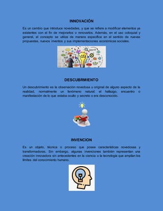 La innovación introduce cambios y mejoras a elementos existentes, el descubrimiento es la observación novedosa de aspectos desconocidos de la realidad, y la invención es un objeto, técnica o proceso con características novedosas que transforman y amplían los límites del conocimiento.