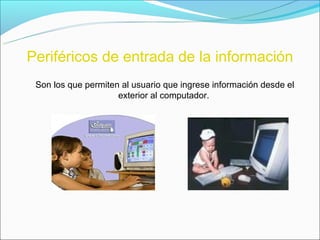 Los periféricos de entrada permiten al usuario ingresar información al computador e incluyen el ratón, teclado, escáner, cámara web, micrófono y lector óptico. Los periféricos de salida muestran el resultado de las operaciones del computador e incluyen el monitor, impresora y parlantes. Todos los periféricos se conectan a puertos específicos en la CPU como USB, VGA, audio y puertos paralelos y serie.