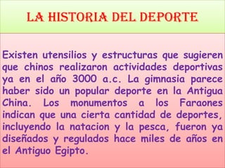 El documento describe la historia del deporte en la antigüedad. Explica que existen evidencias de actividades deportivas en China desde el 3000 a.C. y que los egipcios practicaban deportes como la natación y la pesca hace miles de años. Además, señala que los primeros Juegos Olímpicos registrados ocurrieron en el 776 a.C. en Grecia y que los griegos le daban gran importancia al deporte y la gimnasia como parte de su estilo de vida para mantener una mente sana en un cuerpo sano