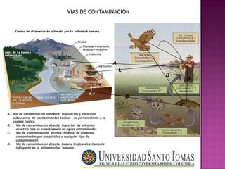 Este documento resume las principales vías de contaminación ambiental y sus efectos en la salud humana. Describe cuatro vías de contaminación directa e indirecta, como la inhalación y absorción de contaminantes o la ingestión de alimentos contaminados. También explica los efectos nocivos de metales pesados como el cadmio, mercurio y plomo. Finalmente, concluye que la contaminación del agua y la cadena alimenticia representan un gran riesgo para los humanos y que factores ambientales y una dieta poco saludable pueden desencadenar problemas de salud