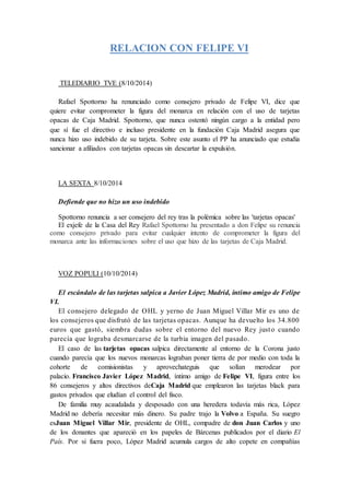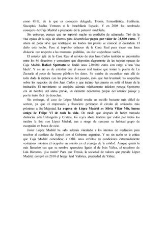 Rafael Spottorno renunció como consejero privado de Felipe VI para evitar comprometer al monarca con el escándalo de las tarjetas opacas de Caja Madrid, aunque Spottorno niega haber hecho un uso indebido de su tarjeta. El escándalo también salpica a Javier López Madrid, amigo íntimo de Felipe VI y consejero de Caja Madrid, que usó una tarjeta opaca para gastos personales de 34,800 euros a pesar de su gran riqueza. El caso complica los esfuerzos de la Casa Real por