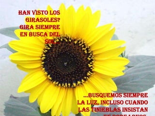 Este documento contiene varios poemas y reflexiones cortas sobre temas como la fe, la esperanza, la gratitud, la belleza de la creación y el deseo de paz, salud y éxito para los lectores. Alienta a las personas a buscar siempre la luz incluso en momentos de oscuridad y a trabajar para construir un futuro de constante paz y tolerancia a través de sus acciones en el presente.