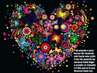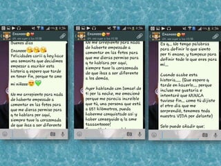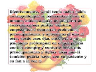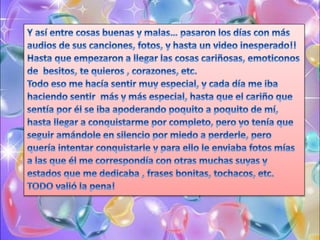 Este documento narra la historia de amor entre Daniel y Rocío, quienes se conocieron a través de Instagram y comenzaron a hablar por WhatsApp. Compartieron sus aficiones musicales y Rocío quedó encantada con la voz de Daniel al escucharlo tocar la guitarra. Con el tiempo, descubrieron que se habían enamorado y decidieron comenzar una relación, aunque viven lejos el uno del otro. Rocío está dispuesta a apoyar a Daniel para poder estar juntos en el futuro.