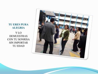 Este documento celebra el día del maestro destacando las cualidades positivas de los maestros. Resalta que los maestros traen alegría, son figuras de apoyo como amigos y hermanos, y trabajan en equipo de manera armoniosa. Además, los maestros se esfuerzan por actualizarse constantemente para brindar la mejor educación a los estudiantes y construir un Perú mejor.