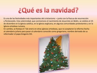 La Navidad conmemora el nacimiento de Jesucristo y se celebra el 25 de diciembre en la mayoría de iglesias cristianas. Otras iglesias ortodoxas la festejan el 7 de enero. Tradicionalmente incluye una cena de medianoche, belenes que representan el nacimiento, y el intercambio de regalos. Aunque originalmente religiosa, la Navidad ahora también incluye tradiciones seculares como Santa Claus y pasar tiempo en familia. Santa Claus se inspira en San Nicolás y según la leyenda
