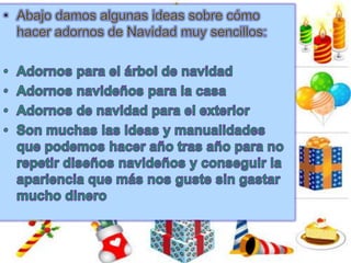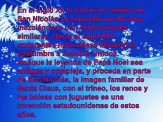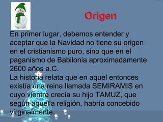 El documento describe el origen pagano de la Navidad hace aproximadamente 2600 años a.C. en Babilonia, donde la reina Semíramis supuestamente concibió virginalmente a su hijo Tamuz. También describe la tradición cristiana de Papá Noel inspirada en San Nicolás, un obispo del siglo IV conocido por su generosidad, y cómo la costumbre de intercambiar regalos en Navidad se originó a partir de sus actos de caridad.