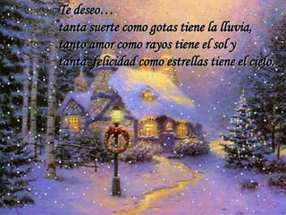 Este documento contiene una serie de deseos y reflexiones sobre la felicidad, el amor y la paz. Expresa el deseo de que la persona tenga mucha suerte, amor y felicidad en su vida. También habla sobre luchar por la ilusión y el amor, y regalar amor a los seres queridos en Navidad. Finalmente, desea que nunca le falten sueños, proyectos, lugares a donde ir y personas a querer.