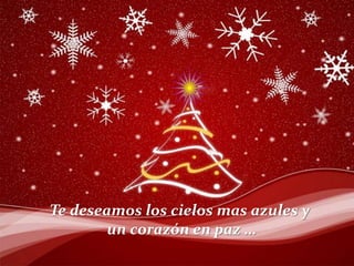 Este documento presenta los deseos de una familia para su ser querido en Navidad, los cuales incluyen tener una vida larga y feliz con cielos azules, coraje para perseguir sus sueños, éxito en sus metas, y estar rodeado de personas importantes que también lo valoren. Se le desea paz interior, comprensión para los momentos difíciles, y que pueda vivir en armonía consigo mismo y los demás.