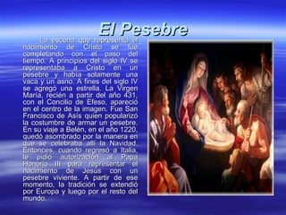 El documento describe la evolución de la escena del pesebre a través de los siglos, comenzando con solo un pesebre, un asno y una vaca en el siglo IV, agregándose una estrella a fines de ese siglo y la Virgen María recién en el 431 d.C. Fue San Francisco de Asís quien popularizó la tradición de armar un pesebre en el siglo XIII luego de quedar impresionado por cómo se celebraba la Navidad en Belén.