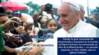 El documento habla sobre el Año de la Misericordia convocado por el Papa Francisco, un periodo especial para que la Iglesia Católica se centre en la misericordia, el perdón y la sanación. Insta a las Voluntarias Vicentinas a seguir el ejemplo de San Vicente de Paúl ayudando a los más pobres de forma corporal y espiritual, y promoviendo su dignidad y desarrollo para mejorar su calidad de vida.