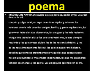 Este poema describe el deseo del autor de armar un árbol de Navidad en su corazón y colgar en él los nombres de sus amigos y familiares queridos, tanto los que vive cerca como lejos, los antiguos y recientes, aquellos que ve a diario y los que ve rara vez, los que recuerda siempre y los que a veces olvida, los de momentos difíciles y felices, los que lo hirieron sin querer y aquellos que conoce profundamente o poco, así como sus amigos humildes y importantes, aquellos que le en