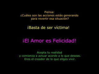 El documento ofrece consejos para superar momentos de bajón emocional y convertirse en el creador de la propia primavera interior. Recomienda escribir los sentimientos, aceptar la realidad y actuar de acuerdo con los deseos, ya que cada uno elige cómo vivir. Además, propone diversas acciones para cultivar el amor propio y disfrutar de la vida, como expresar alegría, aprender, compartir con los demás y generar entornos de paz.