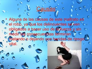 Este documento explora cuatro causas principales del femicidio en Chile: 1) robos que terminan en violencia letal, 2) la creencia de superioridad del hombre sobre la mujer y el placer de someterla, 3) celos extremos que llevan a reacciones agresivas, y 4) alcoholismo de los maridos que conduce a violencia cuando llegan borrachos a casa.