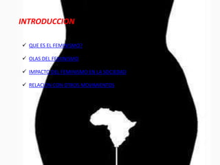 El documento describe el feminismo y sus tres olas principales. La primera ola en el siglo XIX y principios del XX se centró en la igualdad legal, mientras que la segunda ola del 1960 al 1990 abordó una variedad de temas como la desigualdad, sexualidad y familia. La tercera ola surgió en respuesta a las limitaciones percibidas de la segunda ola y enfatiza la diversidad de experiencias de las mujeres. El feminismo ha tenido un gran impacto en la legislación y sociedad para promover los derechos de las mujeres.