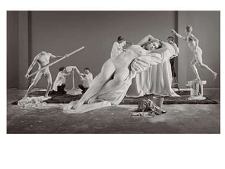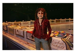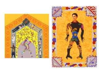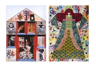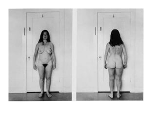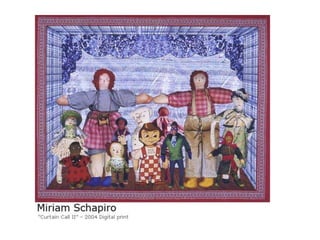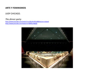 Este documento presenta información biográfica y sobre el trabajo de varias artistas feministas importantes como Judy Chicago, Carole Schneemann, Adrian Piper, Mona Hatoum, Marta Rosler, Barbara Kruger, Kiki Smith, Eva Hesse, Niki de Saint Phalle, Yoko Ono, Nancy Spero y Harmony Hammond. Las artistas abordaron temas como el cuerpo femenino, los estereotipos de género, la identidad y la situación de la mujer a través de instalaciones, performances, pinturas y otros medios visuales para promover el discur