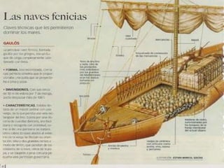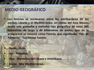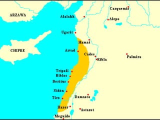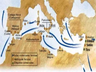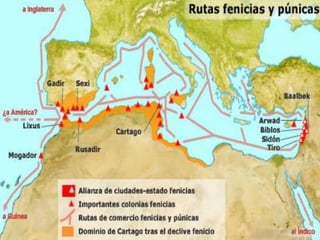 Los fenicios se establecieron en una estrecha franja de 200 km de largo y 40 km de ancho entre el Líbano y el Mediterráneo. Esta civilización comerció intensamente entre los siglos X y V a.C., estableciendo colonias en el norte de África y sur de Europa. Sus ciudades-estado eran independientes políticamente y entraban en conflicto a veces, aunque también formaban alianzas. Los fenicios se dedicaron al comercio marítimo para obtener recursos debido a las limitaciones geográfic