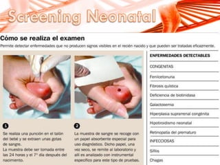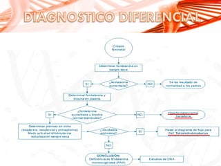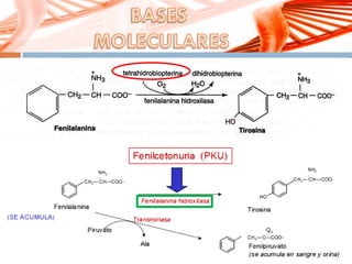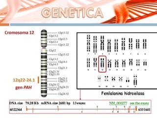 El documento describe la fenilcetonuria (PKU), un trastorno genético del metabolismo causado por un defecto en la enzima fenilalanina hidroxilasa. Esto provoca una acumulación tóxica de fenilalanina en la sangre que puede causar retraso mental si no se trata mediante una dieta baja en fenilalanina. Se explican los síntomas, las pruebas de diagnóstico, las opciones de tratamiento como la dieta y suplementos, y los aspectos genéticos y de seguimiento de la enfermed