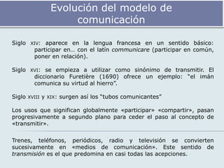 La comunicación implica un emisor, un mensaje, un canal, un receptor. Tradicionalmente se ha definido como el intercambio de información entre entidades a través de señales. Existen diferentes modelos como el lineal de Shannon o el circular de Wiener. El proceso implica que el emisor codifica y transmite un mensaje a través de un canal, el receptor lo decodifica y puede dar una respuesta.