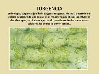 Este documento describe los fenómenos celulares de turgencia y plasmólisis en células vegetales. La turgencia ocurre cuando las células absorben agua, hinchanse y ejercen presión contra las membranas celulares. La plasmólisis ocurre cuando las células se colocan en un medio hipertónico, pierden agua hacia el exterior y se colapsan. La diferencia en la presión osmótica debido a diferencias en la concentración de solutos determina si ocurre la turgencia o la plasmólisis.