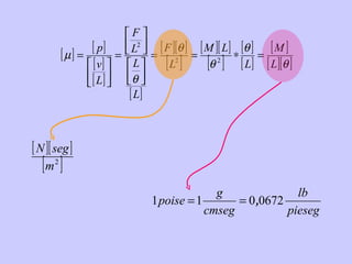 6. VISCOSIDAD Constantede proporcionalidad entre el esfuerzo cortante y el gradiente de velocidad. Llamada viscosidad dinámica . Dimensiones y Unidades: