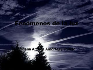 Este documento resume tres fenómenos de la luz: 1) Los rayos de luz se componen de ondas y partículas llamadas fotones que viajan en una dirección desde su origen; 2) La luz muestra un comportamiento ondulatorio que causa interferencia constructiva cuando las ondas están en fase; 3) La luz también se comporta como partículas llamadas fotones que transfieren energía a la materia.