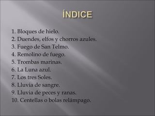Este documento describe 10 fenómenos meteorológicos extraños como bloques de hielo, duendes, fuego de San Telmo, remolinos de fuego, trombas marinas, la Luna azul, los tres soles, lluvia de sangre, lluvia de peces y ranas, y bolas relámpago. Cada fenómeno se describe brevemente, incluyendo fotos e información sobre su formación y características. El documento concluye que aunque se conocen algunos de estos fenómenos, todavía hay mucho por descub