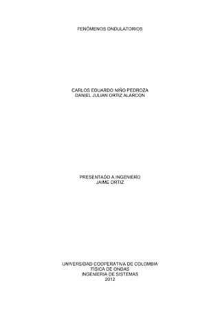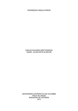 Este documento presenta un estudio sobre fenómenos ondulatorios realizado por Carlos Eduardo Niño Pedroza y Daniel Julian Ortiz Alarcon para la Universidad Cooperativa de Colombia. El documento explica conceptos como vibración armónica, ondas transversales, ondas longitudinales, interferencia, ondas estacionarias, frentes de onda, difracción, reflexión y refracción.