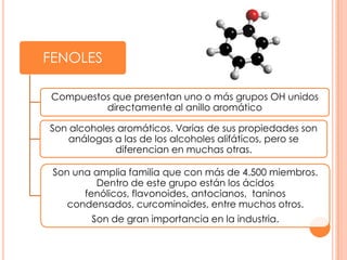 Este documento trata sobre los fenoles, compuestos orgánicos que contienen uno o más grupos hidroxilo unidos directamente al anillo aromático. Los fenoles presentan propiedades físicas y químicas similares a los alcoholes alifáticos pero también se diferencian en algunas propiedades importantes como su acidez. Dentro de las reacciones características de los fenoles se encuentran la oxidación a quinonas y las sustituciones electrófilas aromáticas. El documento también describe la nomencl