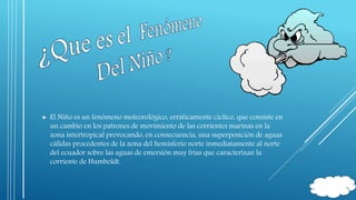 El fenómeno de El Niño consiste en un cambio en los patrones de corrientes marinas en la zona intertropical que provoca el calentamiento de las aguas del Pacífico ecuatorial. Jacob Bjerknes fue el primer meteorólogo en sugerir una explicación razonable de El Niño, relacionando las altas temperaturas oceánicas con vientos débiles y lluvias intensas. El Niño afecta principalmente el cronograma de siembras, el consumo de agua y la oferta y demanda de productos agropecuarios.