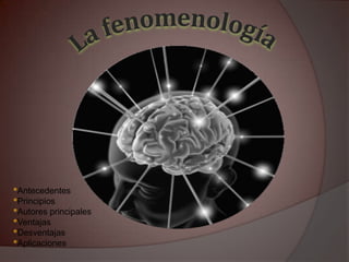 Este documento presenta un resumen del método fenomenológico. Explica sus antecedentes, principios y autores principales como Husserl, Heidegger y Sartre. Describe las fases del método fenomenológico incluyendo la intuición, análisis, descripción y suspensión de creencias. Finalmente, destaca las aportaciones de este método como dar primacía a la experiencia subjetiva y estudiar fenómenos desde la perspectiva de los sujetos.