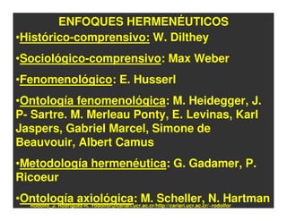 El documento presenta una lista de diferentes enfoques hermenéuticos, incluyendo el enfoque fenomenológico de Edmund Husserl, fundador del movimiento fenomenológico. Husserl propuso el método de la epokhé o reducción fenomenológica para poner entre paréntesis los supuestos sobre el mundo con el fin de acceder a las esencias de las cosas. Distinguió entre la noesis, el proceso intencional de conocimiento, y el noema, el contenido intencional resultante.