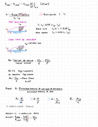 Este documento describe los conceptos fundamentales de la convección, incluyendo los tipos de convección (libre y forzada), las propiedades que afectan la convección (viscosidad, conductividad térmica, densidad, velocidad del fluido, calor específico, configuración geométrica), y los regímenes de flujo (laminar y turbulento). También explica cómo calcular el coeficiente de transferencia de calor por convección y el número de Nusselt para diferentes geometrías y condiciones de flujo.