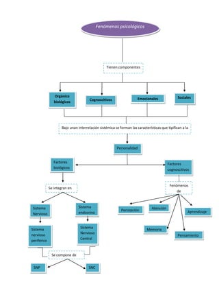 El documento describe cómo el sistema nervioso, el sistema endocrino y factores biológicos, cognitivos y sociales interactúan de manera sistémica para formar las características de la personalidad humana, incluyendo el pensamiento, la memoria, la percepción y la atención.