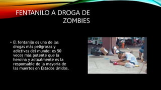 El documento describe los peligros del fentanilo, una droga 50 veces más potente que la heroína que se ha vinculado a la mayoría de las muertes por sobredosis en Estados Unidos. El fentanilo fabricado ilegalmente a menudo se mezcla con otras drogas sin que los usuarios lo sepan, lo que aumenta el riesgo de sobredosis. Al igual que otras drogas opioides, el fentanilo actúa en el cerebro para producir placer pero también crea adicción con el uso repetido. Una sobredosis de fentanilo puede