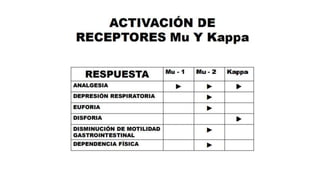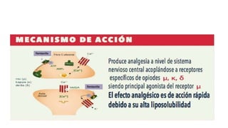 El documento describe los mecanismos de acción y farmacología del fentanilo y remifentanilo. El fentanilo es un potente agonista opioide que actúa principalmente en receptores mu, produce depresión respiratoria en dosis dependiente, y tiene una duración de acción menor a una hora. El remifentanilo es un agonista puro de receptores mu con acción ultracorta cuya farmacocinética no se ve afectada por insuficiencia hepática o renal. Ambos fármacos producen analgesia a través de la modulación