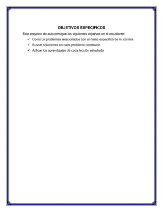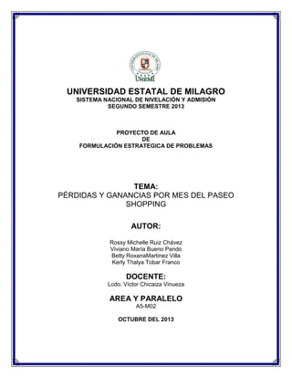 Este documento presenta un proyecto de aula sobre la formulación de problemas estratégicos relacionados con las pérdidas y ganancias mensuales de un centro comercial llamado Paseo Shopping. El proyecto fue realizado por cuatro estudiantes y su docente, y busca que los estudiantes construyan problemas, busquen soluciones y apliquen conocimientos de la carrera. Se presentan los objetivos del proyecto y anexos con información sobre los estudiantes y el tema seleccionado.
