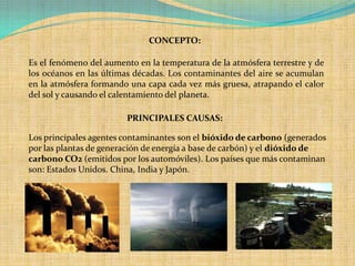El calentamiento global se refiere al aumento de la temperatura promedio de la Tierra debido a la acumulación de gases de efecto invernadero en la atmósfera, principalmente emitidos por la quema de combustibles fósiles y la deforestación. Esto está causando consecuencias graves como el derretimiento de glaciares, sequías, huracanes más intensos, y el aumento del nivel del mar, amenazando ecosistemas y comunidades humanas. Los principales emisores de gases de efecto invernadero son Estados Unidos, China, India y Jap