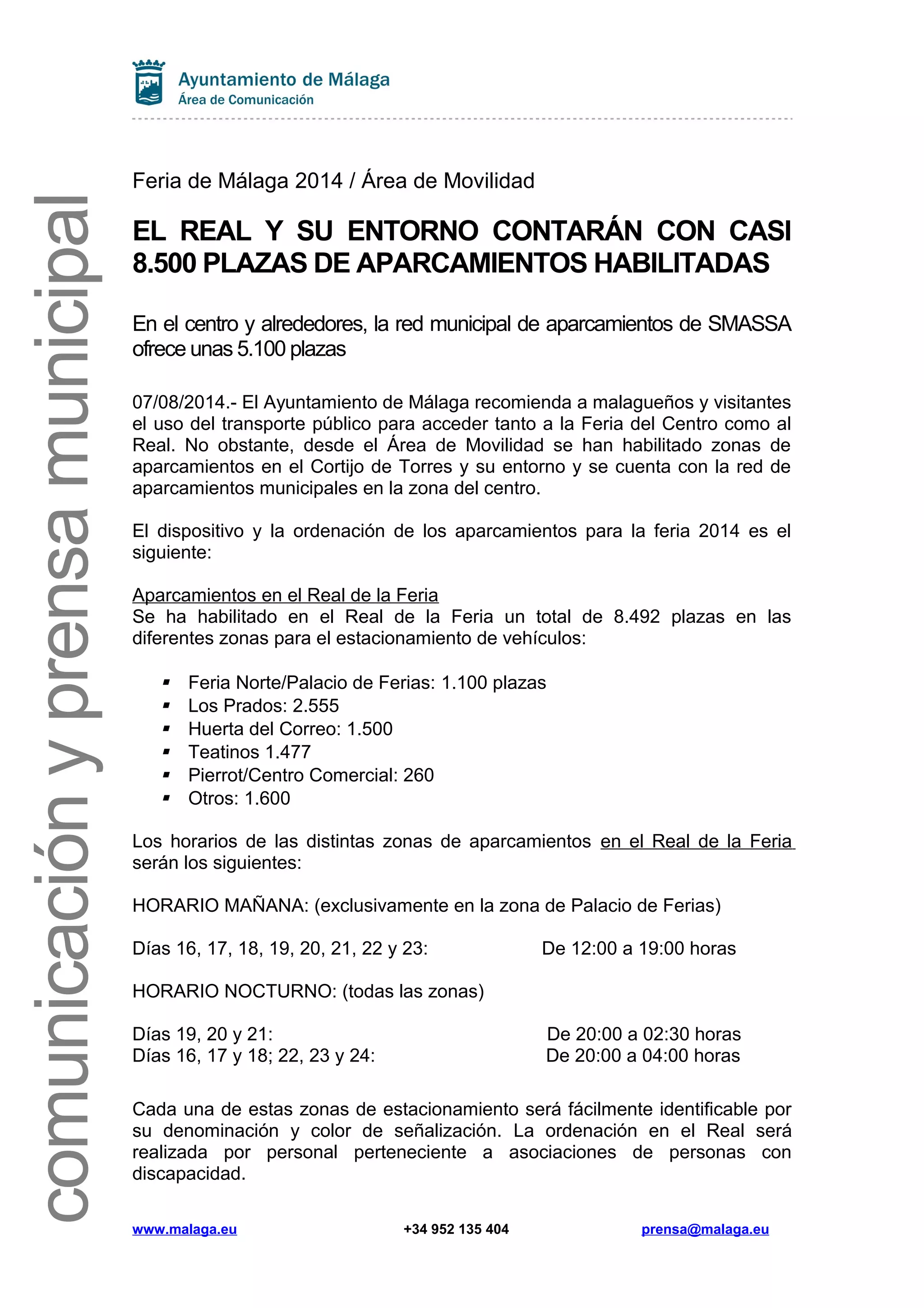 Durante la feria de Málaga 2014, se dispondrán casi 8,500 plazas de aparcamiento en el Real y sus alrededores, junto con una red municipal de 5,100 plazas. Se recomienda el uso del transporte público y se especifican horarios de acceso y regulación de aparcamientos para facilitar la movilidad. Las zonas de aparcamiento estarán claramente señalizadas y contarán con personal para su ordenación.