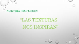 El documento presenta una propuesta educativa para niños de 5 años sobre las texturas. La propuesta se enfoca en desarrollar el conocimiento artístico y de lenguas a través del reconocimiento y comparación de texturas visuales y táctiles, y la descripción de objetos. Los objetivos son generar experiencias sensoriales con diferentes texturas y potenciar el uso educativo de las computadoras XO, trabajando con aplicaciones como mapas mentales, navegación, grabación y escritura.