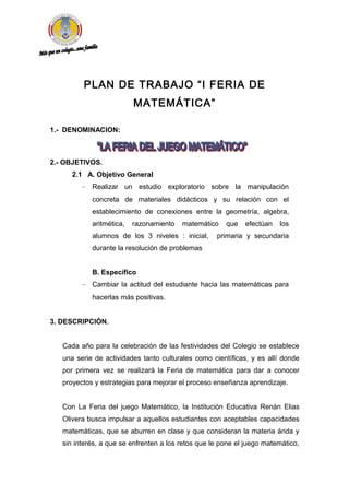 El plan de trabajo 'I Feria de Matemática' tiene como objetivo general realizar un estudio sobre la manipulación de materiales didácticos y mejorar las actitudes de los estudiantes hacia las matemáticas. Se desarrollarán actividades lúdicas que involucren juegos matemáticos para fomentar el aprendizaje y la resolución de problemas en alumnos de inicial, primaria y secundaria. La feria se llevará a cabo del 17 al 25 de septiembre de 2012, buscando la participación activa de estudiantes y docentes en un ambiente atractivo.